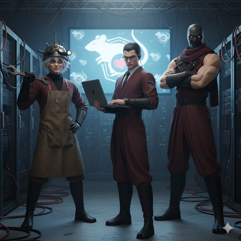 Geminiにヤシロネズミ社のメンバーが着てる制服(忍者コス)の特徴を書いて悪の組織の制服を作ってくれと頼んだらこんないい感じの画像を作ってくれました。