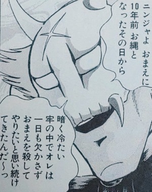 10年後、キン肉マンの息子・万太郎の火事場のクソ力修練のためにハンゾウが一時的に釈放されます。ニンジャはそれを知って危険だと判断し万太郎を守るため、そしてコクモの敵を討つためにハンゾウの前に現れました。