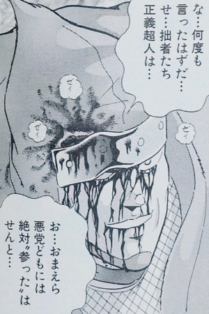 まだ正義超人になりきれてないハンゾウ、ゲッパーランドに水中に引きずり込まれ、妖腕刀も仮面もボロボロにされ大ピンチ。すると襟巻きから、ニンジャの霊があらわれます。
